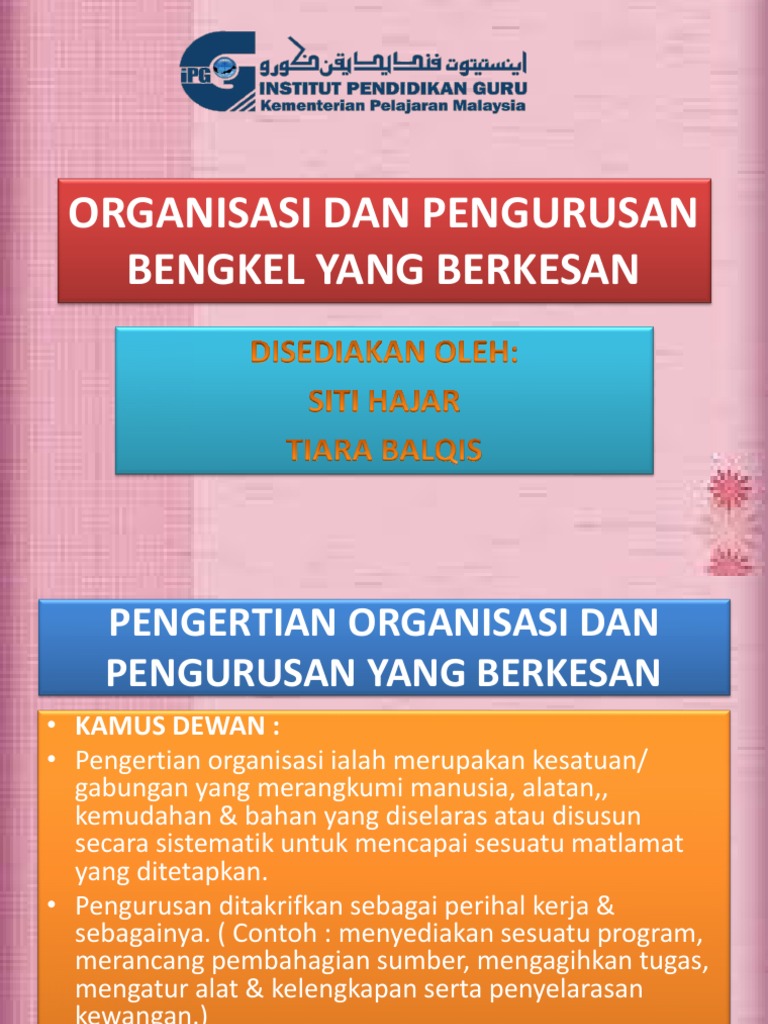 Proses mengelola, mengawal, mengarah semua perkara yang berkaitan dengan program pengajaran di dalam kelas/bengkel. 1.2 skop organisasi dan pengurusan bengkel. Murid akan belajar apabila mereka mempraktikkan perkara yang di ajar dan apabila mereka mempunyai kemahiran berfikir yang baik. Organisasi dan pengurusan bengkell harus diurus dan diorganisasikan untuk memastikan pengajaran dan pembelajaran di bengkel dapat dilaksanakan dengan lancar iaitu secara cekap dan berkesan. Bahagian pesuruhjaya bangunan (cob) kuala lumpur.